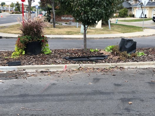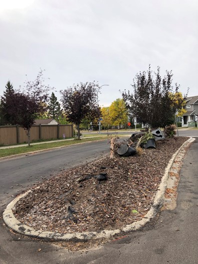 The attached photos were taken earlier today at the boulevard on the corner of Burton Road and Bulyea Road (across from the Brookview COOP).