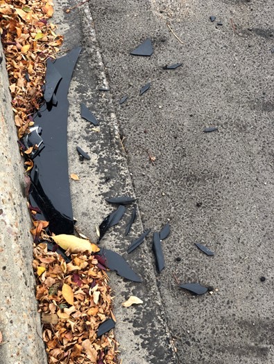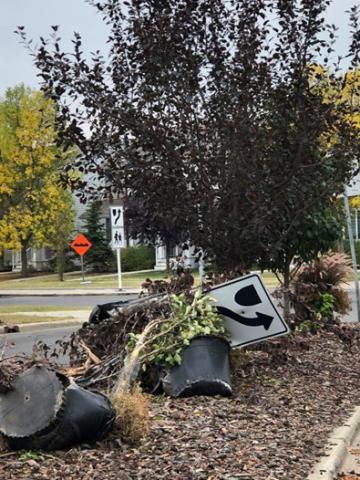 The street sign has been knocked down and some of the trees and flower pots have been damaged (see attached photos).